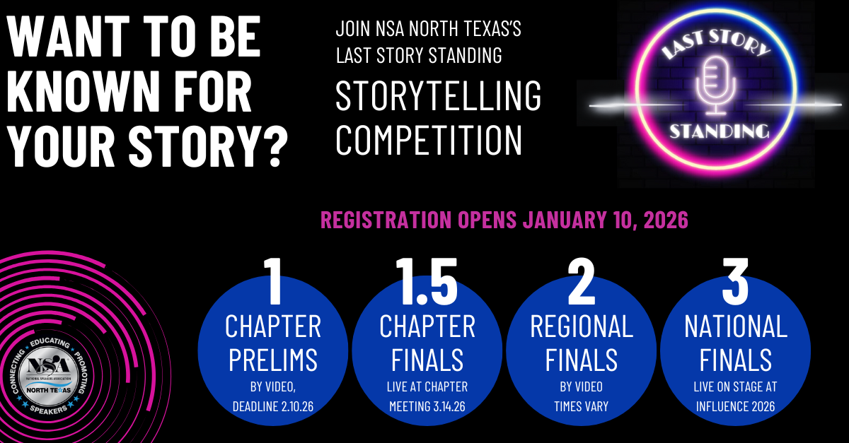 NSA North Texas and the National Speakers Association (National) invite you to participate in the 3rd Annual Storytelling Competition – a unique opportunity designed by professional speakers, for professional and emerging speakers.